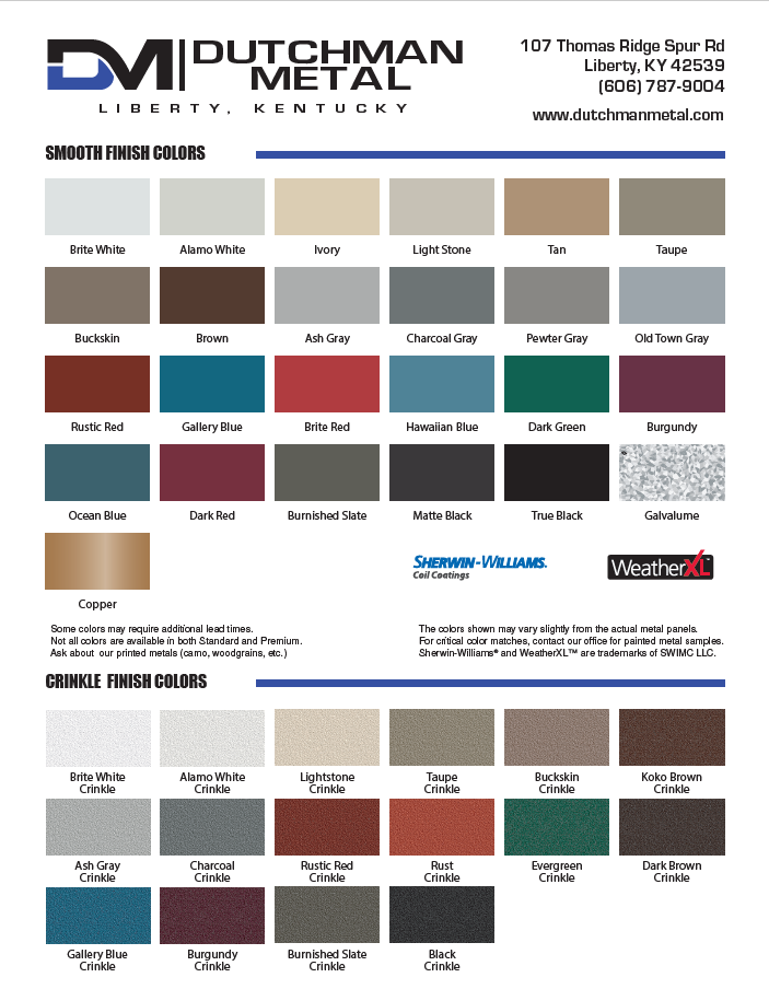 Choose from a wide selection of colors, including #1 Premium smooth finishes and 15 Crinkle Coat options—all backed by a 40-year limited paint warranty and Energy Star certification. For added savings, ask about our rotating inventory of discounted #2 Metals—offering a budget-friendly choice for many projects (availability varies and colors may not match trim or fasteners exactly).